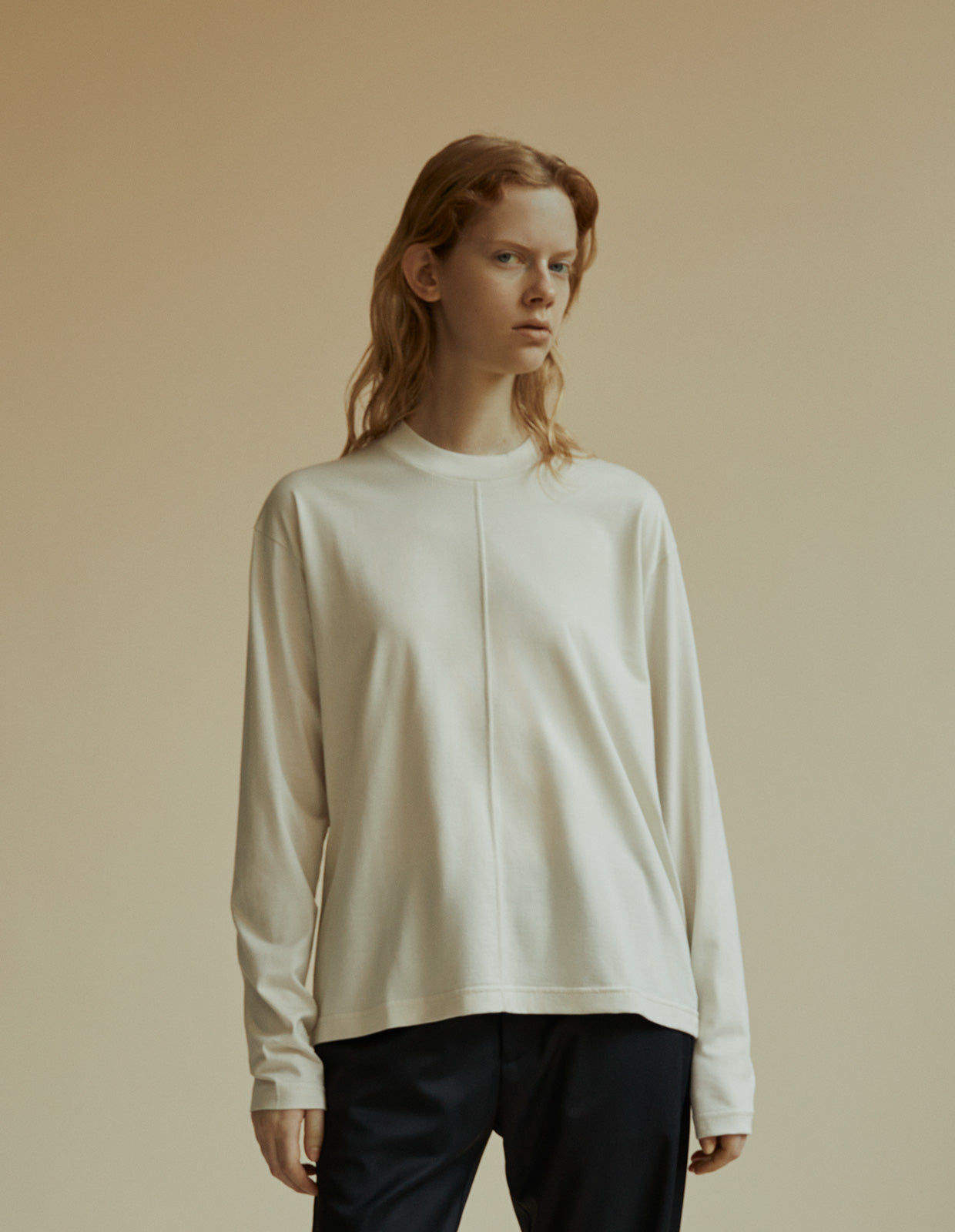センターシームが入っており、ニュアンスを感じさせるミニマルなデザイン。アウターやボトムスにモード感のあるアイテムを合わせると、抜け感を活かしたスタイリングの完成。