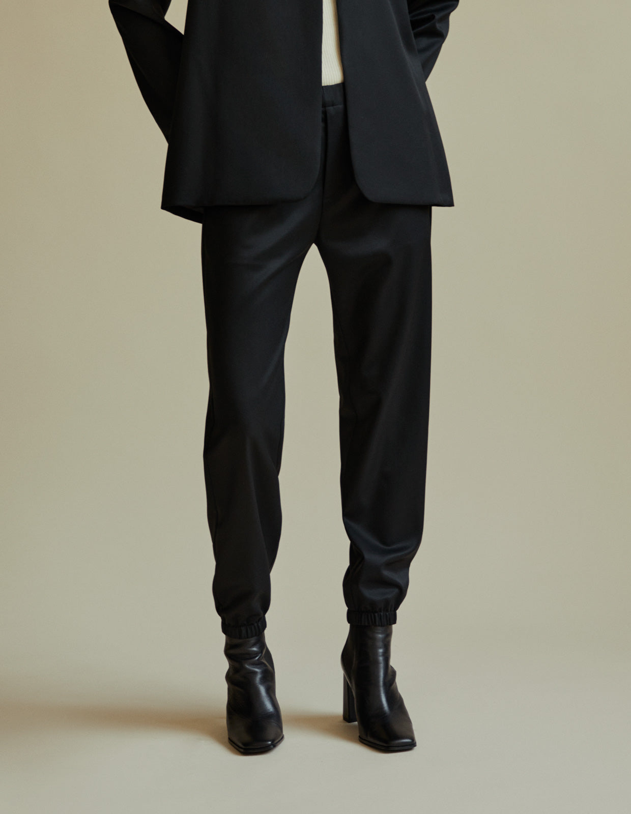 ドロップショルダーのノーカラージャケット、ボトムスはイージーパンツ。光沢感のある生地で、ニットなどと合わせてもモードな雰囲気をサクッと作り出してくれるシンプルなのに優秀なアイテムです。