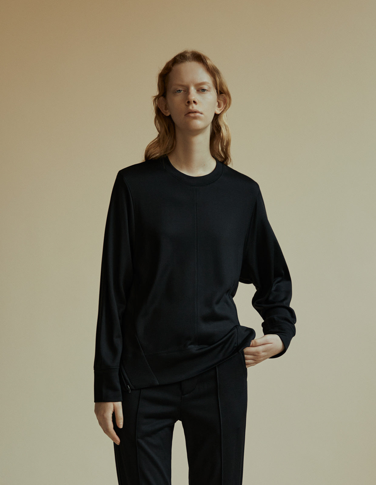 薄い生地として使われることが多いシルクを、裏毛のスウェット生地仕様で贅沢に使ったセットアップ。シルクの中でもとくにランクの高い極細シルクを使用しており、気品あるなめらかな光沢感と艶感に目を奪われます。